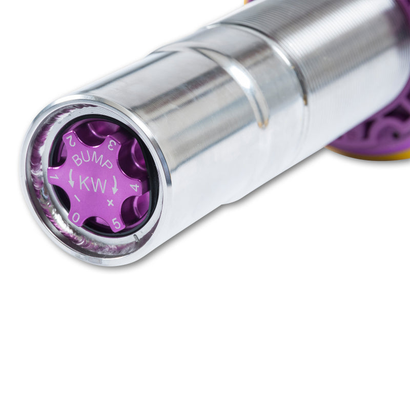 Cutting-edge motorsports technology for more performance on the road. Like every suspension product developed by KW automotive, the suspension manufacturer, and manufactured in Germany, the KW V3 Coilover suspension kit also provides a significant plus in safety reserves in road traffic. Thanks to the chassis with its high-quality dampers, springs, and elastomer spring elements, pitching and rolling movements during load changes such as evasive maneuvers, cornering, acceleration, and braking are significantly reduced. The braking distances are also shortened. Thanks to improved support and feedback, drivers not only feel safer but driving in everyday life becomes even safer. With compression and rebound stage damping, that can be set separately and independently of each other, the damper setup can be customized to your personal driving preferences or vehicle changes such as weight, tire characteristics, or altered vehicle rigidity. True performance optimization is only possible with this unique, patented system. For example, this allows the compression damping force to be increased and get more grip from the tires, to improve cornering behavior and reduce squat without simultaneously altering the rebound stage damping which is optimally matched to the spring rate, a scenario which results in reduced grip and the associated loss of performance. The KW V3 coilover kit is the ideal tool for performance-oriented drivers and experienced tuning enthusiasts who place a strong emphasis on the overall performance of their suspension. The Variant 3 features patented TVR-A and TVC-A technology that provides separately adjustable rebound and compression damping. The extensive adjustment range of the independently configurable rebound and compression make it easy to directly influence the steering behavior, directional stability, grip and handling characteristics for confident and repeatable results at the limit of driving dynamics.