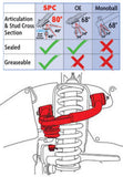 Improve droop travel, drivability and tire wear as well as adjusting tire position in your wheel well with SPC's adjustable front upper control arms for the Toyota Series 100 Landcruiser and Lexus LX470. Featuring our long-life maintainable ball joint and SpecRide bushings, this arm is designed to correct alignment angles while maintaining factory ride quality. SPC's integrated tubular and cast steel design provides the strength and durability needed for the most demanding environments. These remove and replace arms are available in pairs for lifted and off-road applications. Get more droop travel: SPC's arm has improved clearance to get around the spring bucket when the arm droops, eliminating arm to frame contact on lifted trucks. The maintainable ball joint has an oversized ball and allows more than 80? of articulation to ensure it never binds. SpecRide bushings have free pivot to eliminate any chance of bushing failure seen on many high travel suspensions. Get your drivability and tracking back: When you lift your truck you affect caster and camber. SPC's arms have +1? of caster built into them. Using its patented ball joint design the arm will get you -1? to +3? of caster and ?2? of camber. Get your tire where you want it in the wheel well: Use adjustment in the control arm and on the OE lower cams to maximize alignment angles and move oversized tires forward in the wheel well to minimize or avoid fender trimming. Do you need heavy duty rear lower control arms? Check out SPC p/n 25955, which are more than 2x stronger than the OE arms. On the adjustable ball joint SPC uses hex chromate free finish and offers a 700hr salt spray test for the best corrosion protection available.